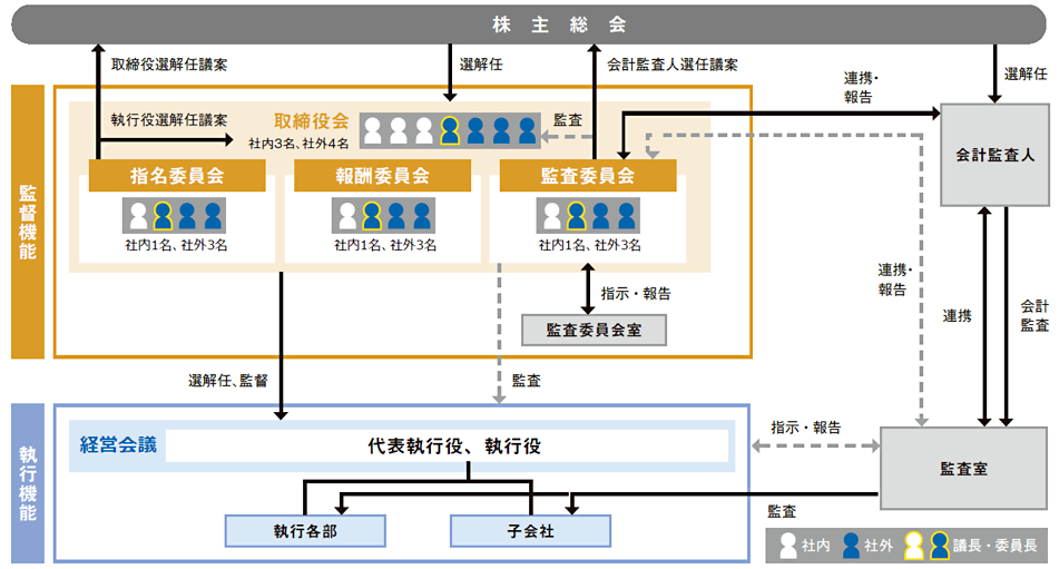 経営監視機能に関しては、指名委員会等設置会社の特徴を生かして、取締役会が執行役を監督するとともに、監査委員会が監査室と連携して、当社に適した効率的な企業価値向上につながる内部統制システムを構築しています。